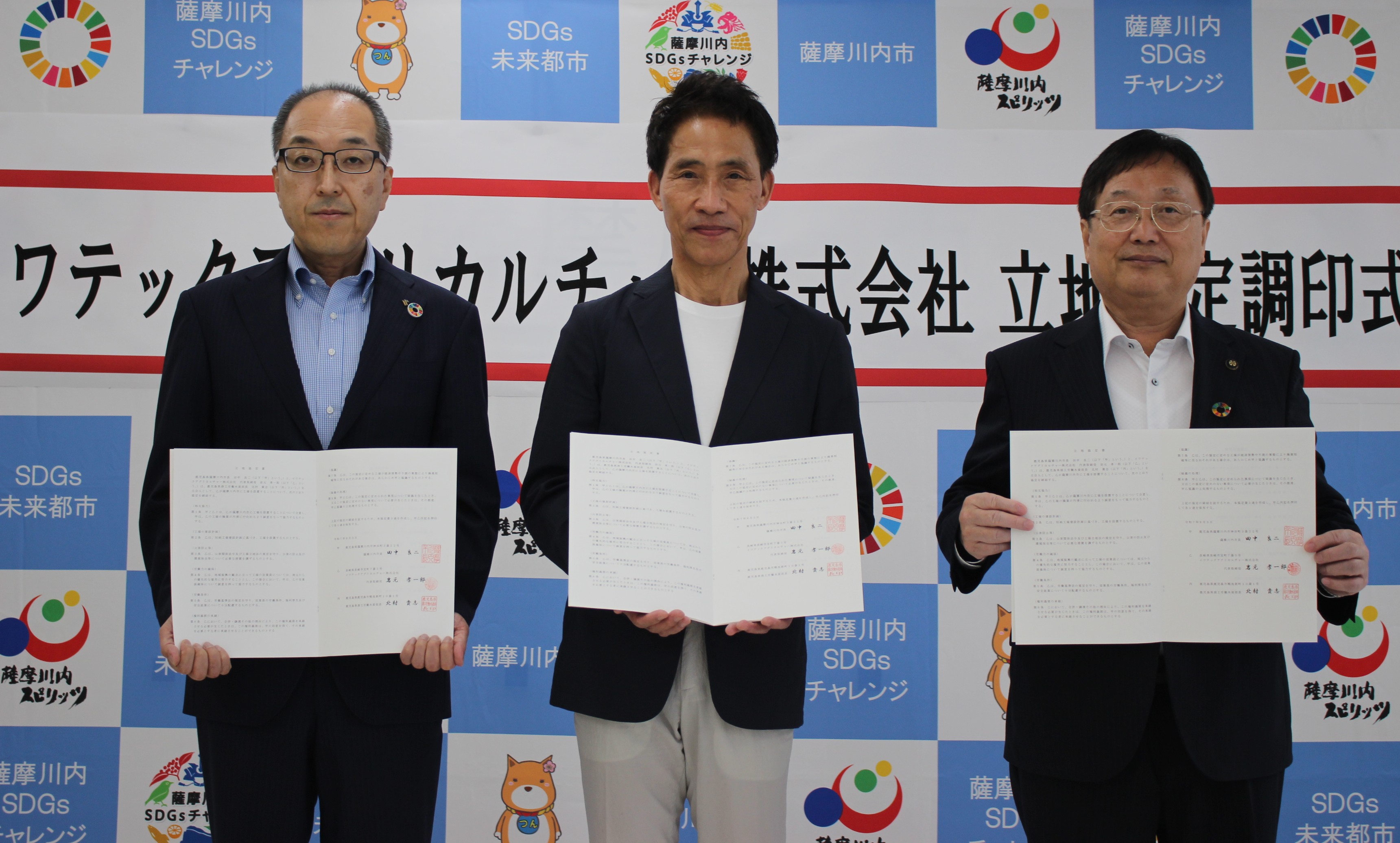 イワテックアグリカルチャー株式会社(薩摩川内市:R7/8/5) 2025年8月5日 最終更新日時 : 2025年12月3日 企業立地ガイド投稿1 イワテックアグリカルチャー株式会社(薩摩川内市:8月5日) 岩元代表取締役(中央),田中薩摩川内市長(右) イワテックアグリカルチャー株式会社は,「再エネ×農業」をテーマに,令和4年に,長崎県において設立しました。 代表の岩元氏の出身地である薩摩川内市へ貢献したいとの思いから,薩摩川内市への立地を決め,令和6年4月,薩摩川内市永利町内において,菌床しいたけの生産・販売を開始しました。生産した製品は,現在,薩摩川内市のふるさと納税の返礼品としても採用しています。 今回の工場建設は,現在,自社他社問わず長崎県から仕入れている菌床を,鹿児島県で製造するため計画されたものであり,輸送コストの約80%並びに菌床仕入に係るコストの約42%削減により,更なる生産体制の強化につなげるとともに,製造した菌床は,九州管内のしいたけ生産者にも販売する予定です。 併せて,同社は薩摩川内市のSDGsチャレンジパートナー制度の登録企業であり,本工場において,発電設備によって再エネ100%による生産体制の構築を目指すほか,菌床しいたけの生産技術を体系的に指導できる教育体制を整備し,地元出身者を中心に,若手の農業従事者の雇用・育成も行うこととしています。 これにより,地域における雇用の創出はもとより,地域産業の浮揚発展に大きく貢献するものと期待されます。 立地協定締結日 令和7年8月5日(火曜日) イワテックアグリカルチャー株式会社の概要(外部サイトへリンク) (1)所在地:長崎県長崎市宝町7番5号(2)設 立:令和4年3月(3)代表者:代表取締役 岩元 孝一郎(4)資本金:100万円 (5)従業員数:28名(6)事業内容:農産物の生産・加工・販売 新設工場の概要 (1)工場名:イワテックアグリカルチャー株式会社 入来工場(2)所在地:鹿児島県薩摩川内市入来町副田5950番33(3)用地面積:9,000㎡(4)建物面積: 2,935㎡(5)着工予定:令和7年8月(6)操業予定:令和8年2月(7)投資予定額:4億357万円(土地代を含む)(8)新規雇用者: 10名(9)事業内容:菌床の製造・販売(10)生産計画:1億1,180万円/年 このページに関するお問い合わせ 鹿児島県商工労働水産部産業立地課 電話番号:099-286-2983